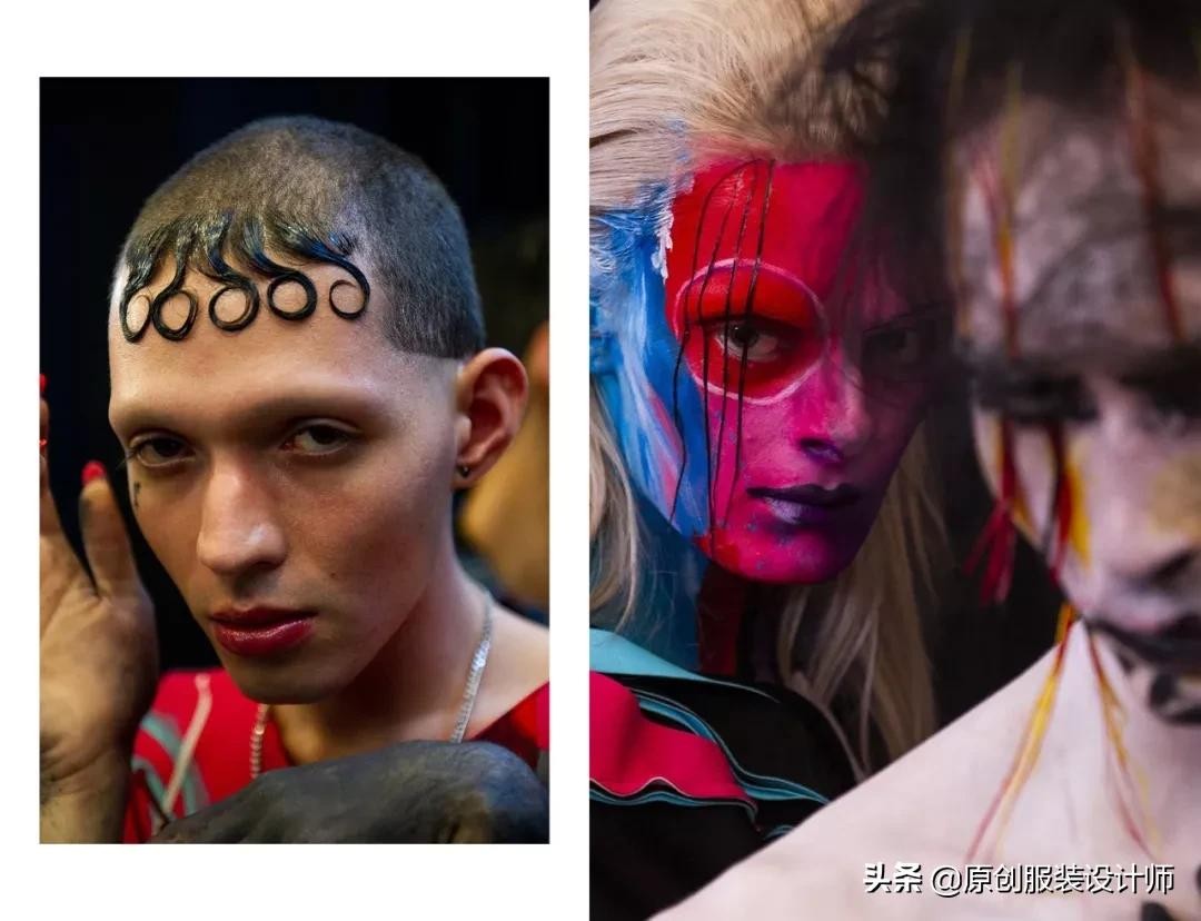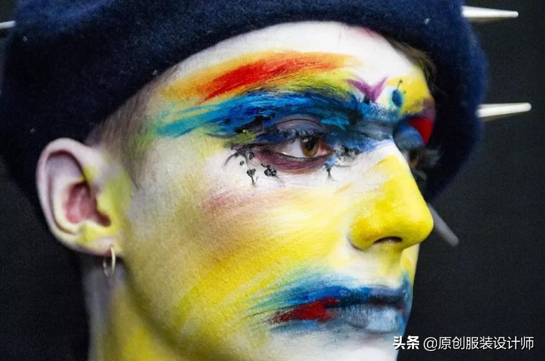 新一季的妆容也是一大亮点,具有非常强的个人辨识度,将Jeffrey式的怪诞美学发挥到极致。模特的脸上涂满了浓烈的彩色颜料,有大胆的色块组合、凌乱的头发,以及充满戏剧性的水彩风格图案。“我想把梦幻和失落的情绪传达给世界,希望它能像时间停止的泡沫一样。“Jeffrey说。