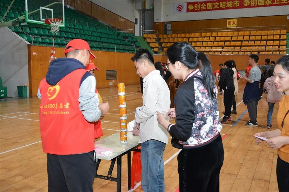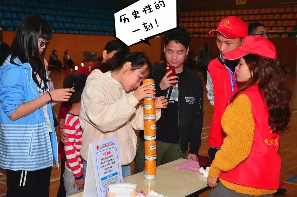 游戏规则:参与者在30秒内将5个易拉罐一个接一个叠成一根柱,并开放手,易拉罐停留10秒不倒。
