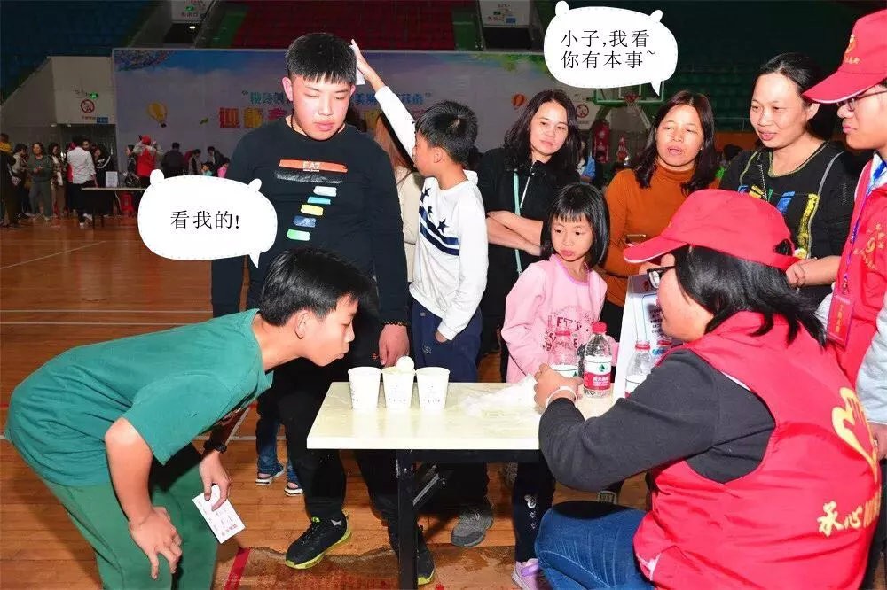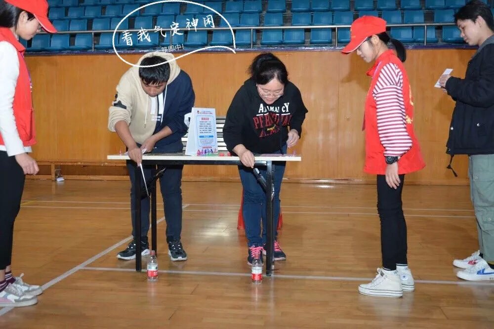 游戏规则:3个装满水的杯子竖着排成一排,第一个杯子放着一个乒乓球,参赛者要将乒乓球从第一个杯子吹向第二个杯子,按顺序依次吹,吹的过程不能跳杯子,不能落地。每人有三次机会。