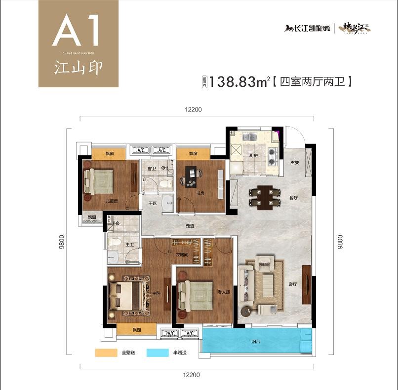 项目在售户型2个:建面约121.29㎡A2户型,3室2厅2卫;建面约138.83㎡A1户型,4室2厅2卫。偏改善。