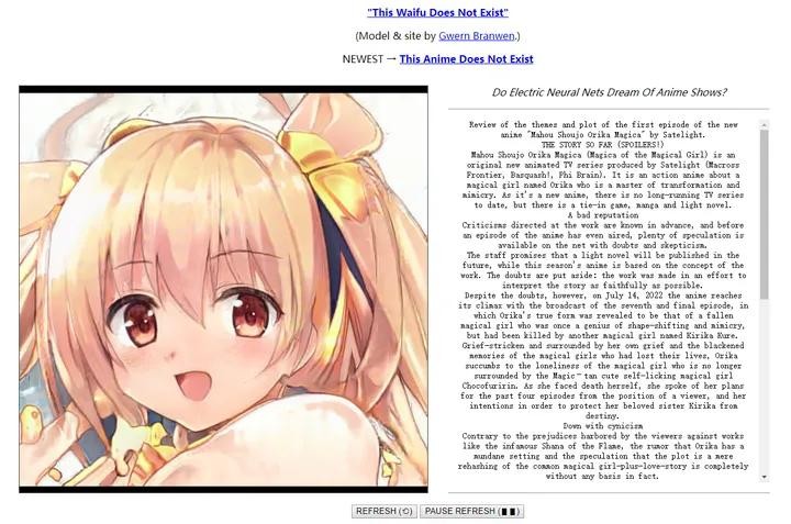 一个随机生成少女动漫的网站,网站每隔十几秒就会自动生成一张好看的动漫图片,还有人物情节介绍。