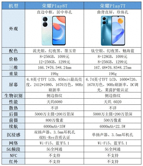 荣耀Play8T是7T的升级版,外观、屏幕、处理器、前摄、快充功率、扬声器等都有升级。两相比较,更推荐8T。当然,7T拥有价格优势。