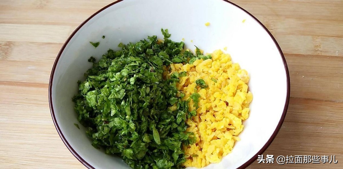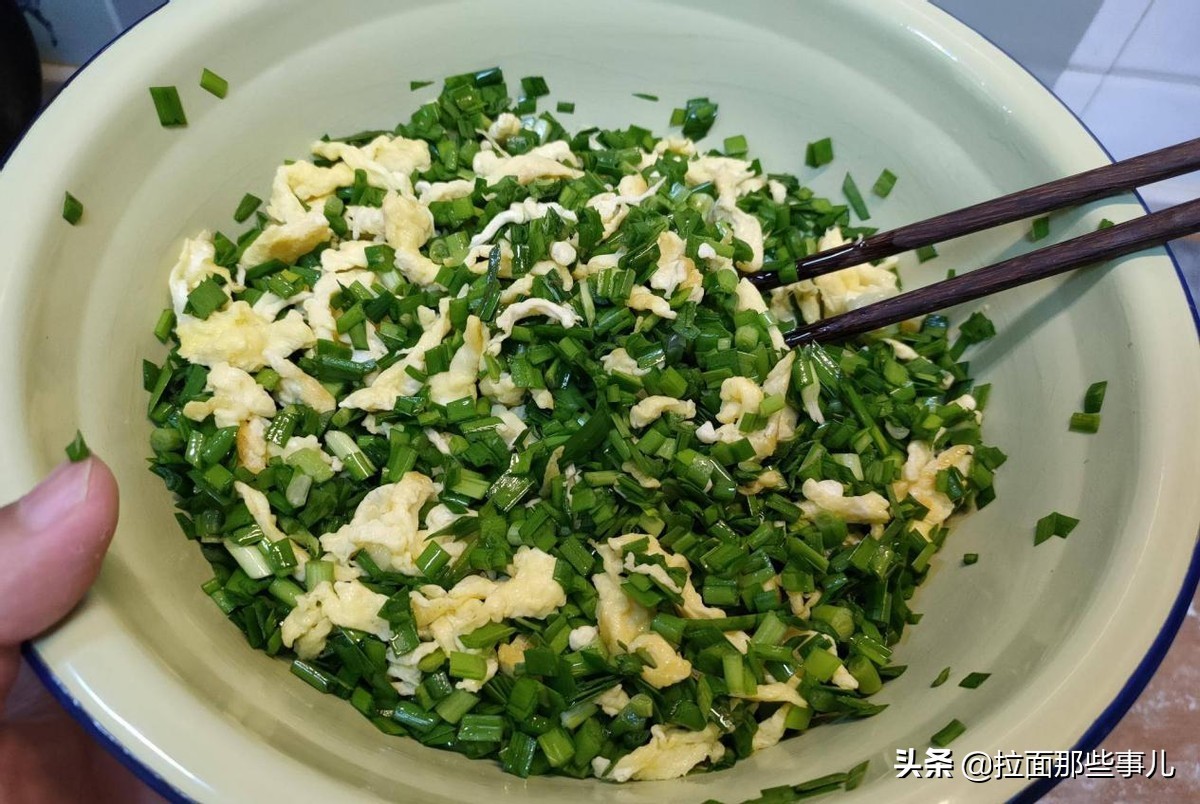 像是刚炒好的鸡蛋,不要立刻倒入韭菜馅中,切记一定要将鸡蛋放凉后再混到一起,因为高温会让韭菜颜色变暗,让其水分流失加快。