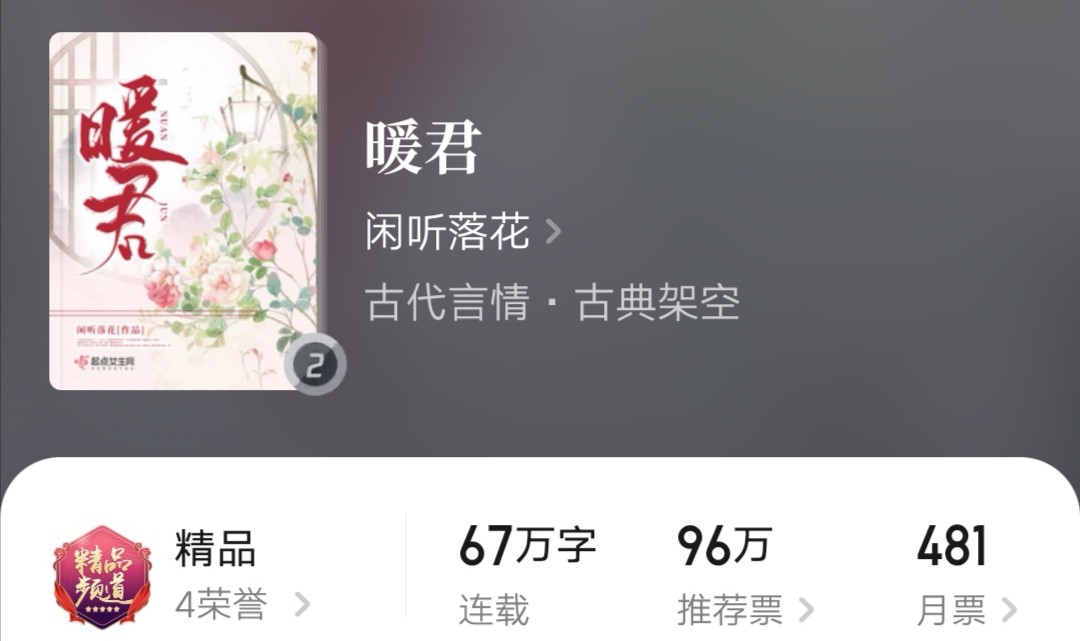 闲大笔下的女主大多都姓李,比如《花开春暖》的女主李小暖、《盛华》女主李夏、《锦桐》女主李桐、《暖君》女主李苒等。