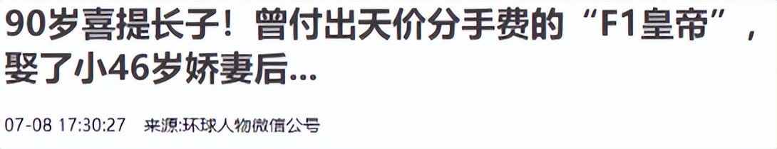 信源:上游新闻《90岁喜提长子!曾付出天价分手费的“F1皇帝”,娶了小46岁娇妻后...》