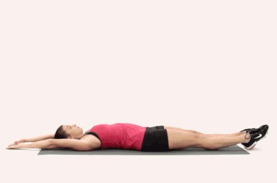动作四:v字卷腹,首先我们平躺在瑜伽垫上,然后将手伸直举过头顶往后倒,脚也绷直,这时候要时刻保持收腹。然后我们腰部发力,抬腿起身,同时手触碰脚尖,发力时呼气,恢复时吸气,每组20个,每天做两组。