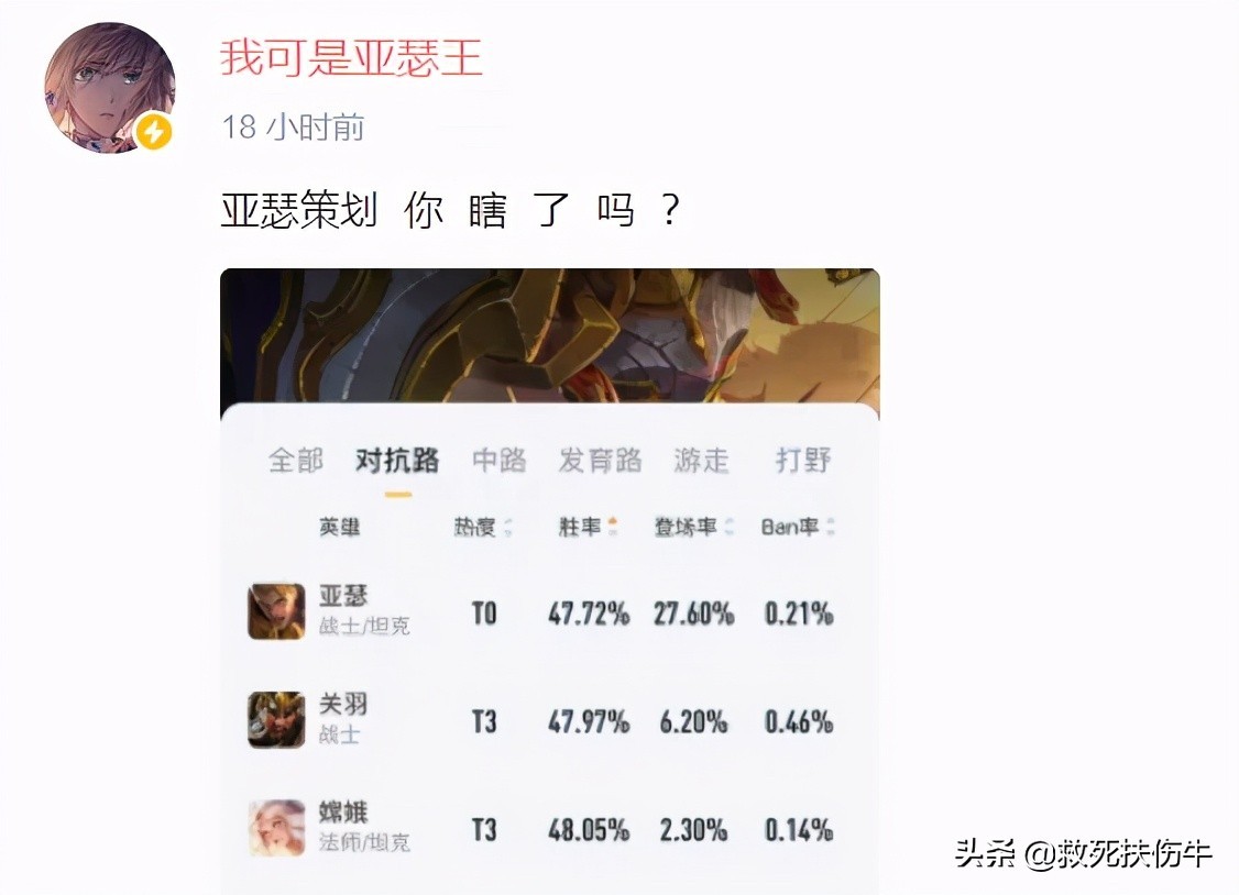 说实在王者荣耀亚瑟这个大招实在配不上那个后摇,大招法术伤害,亚瑟又不可能出法穿装备,后期搁那刮痧,人家曜是法术伤害没错,问题你亚瑟有曜那大招CD?结果这版本亚瑟对抗位移秀儿想要大招刮痧都难。