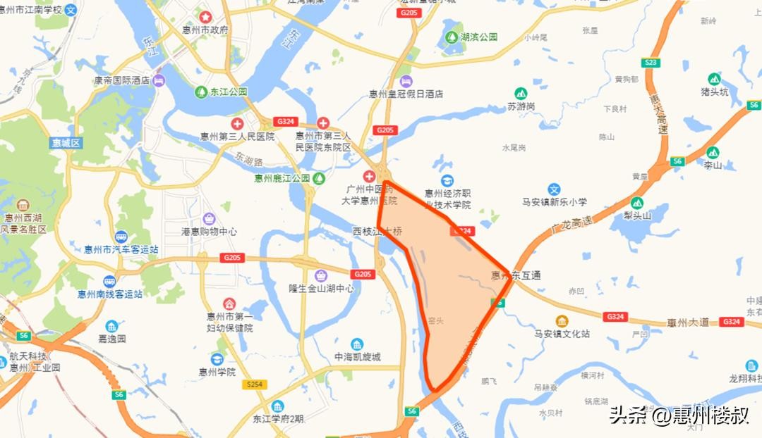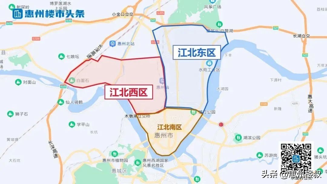 江北西区以从惠州大道出发至长深高速一带,北至金泉路、南至东江(惠博大道)。