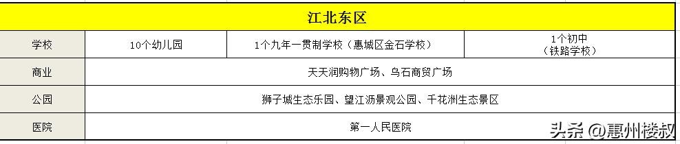 江北东区从惠州大道出发至惠民大道、东江一带,北至广惠高速、南至三环北路,定位为以居住、商贸服务业、电子信息产业、旅游业为主导的综合发展区。
