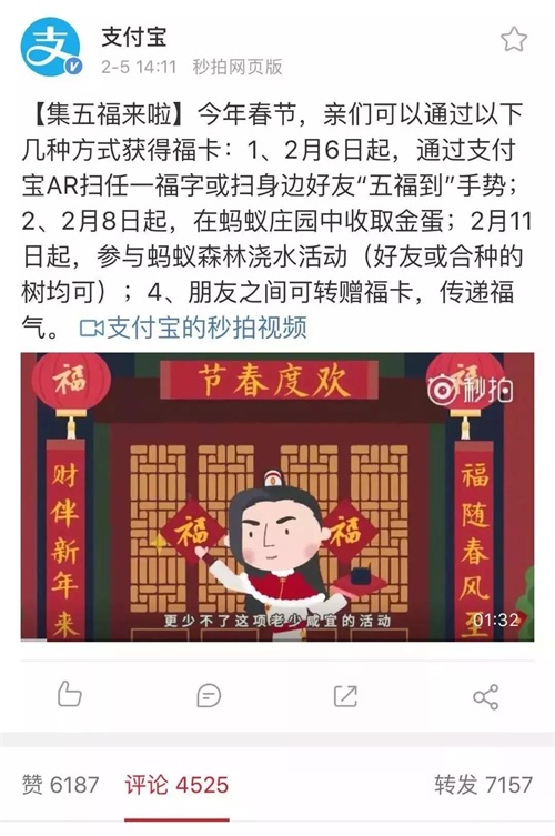 1、自2月6日起,通过支付宝AR扫福字或者身边好友“五福到”手势;