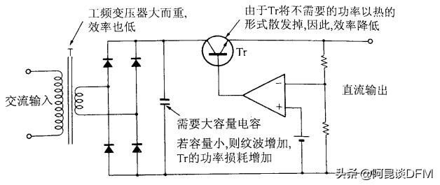 这是串联线性稳压电源,是非常早期的电源,缺点较多(有笨重工频变压器、效率低、发热大,输入输出压差产生的功耗在TR晶体管以热量形式散出等)