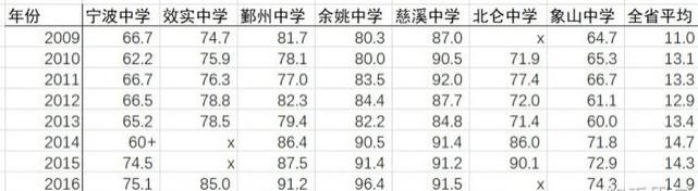 宁波市鄞州中学(原浙江省鄞县中学)创办于1952年,1981年4月,学校被浙江省人民政府批准为省首批办好的十八所重点中学之一,1995年,学校又成为首批验收通过的省一级重点中学,2002年4月20日,正式改名为鄞州中学。2016年,该校共有422人参加高考,其中理科考生352人,321人上一本线,一本率91.2%;文科考生70人,64人上一本线,一本率91.4%;文理合计一本率91.23%。一本率从2014年的86.6%,2015年的87.8%提升到2014年的91.2%。