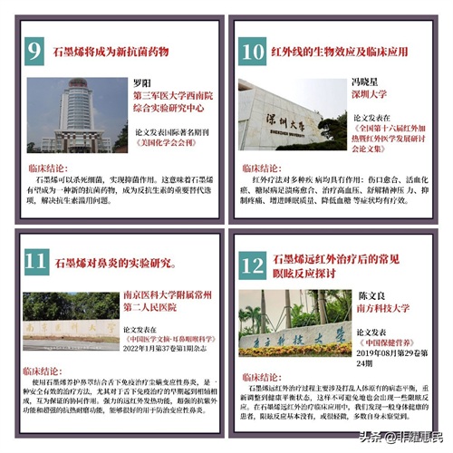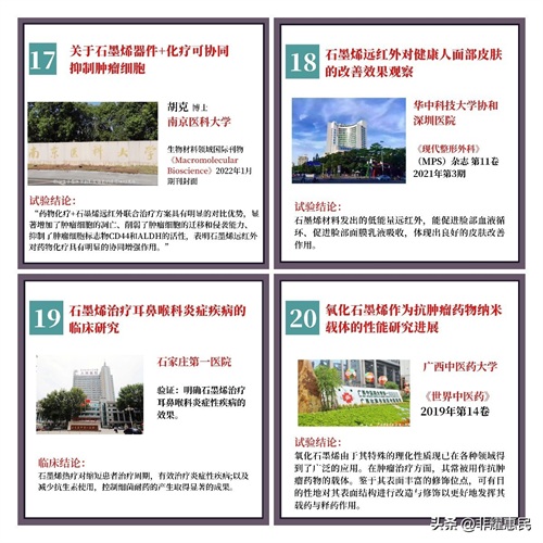 从2018年开始,一些医院和研究者开始用石墨烯做临床试验,都取得了不少的进展。对于常见的寒湿引起的疼痛、腰腿痛、胃痛、失眠、高血压、糖尿病、甚至肿瘤化疗等都陆续开展了研究。