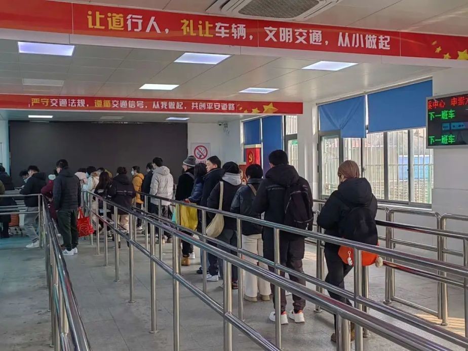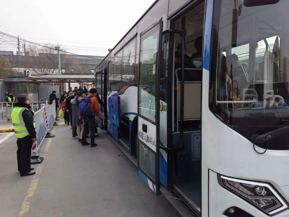 春节期间,为保障站点营运秩序,金高公交二分公司的志愿者在现场疏导客流、安排乘客有序乘车,并耐心解答乘客问题。