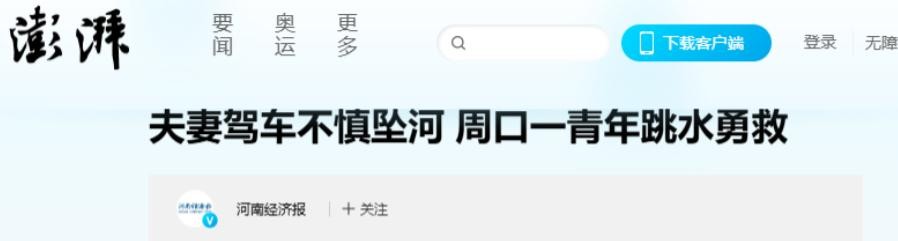 2022年3月,河南周口一对夫妇,在驾车回家的途中,车辆突然失控,不幸落入了河中,关键时刻一名青年,直接跳入河中前去救人,只是在救最后一位女子的时候,这名青年却因为体力耗尽,没办法游上岸,最终只能选择放弃。