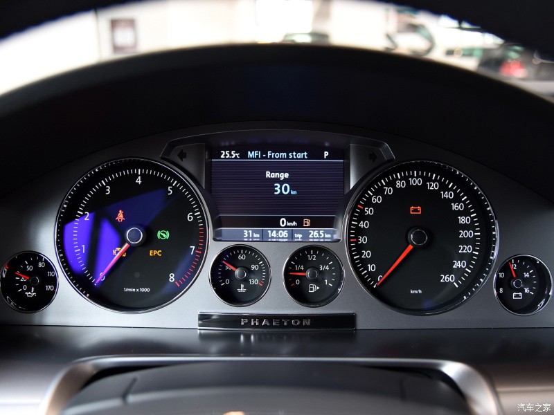 六孔设计的仪表盘和宾利很像,采用金属组件加周圈镀铬设计使得仪表盘观感很奢华,蓝光膜的采用使得外部光线照在仪表盘上时会发出幽幽的蓝光。