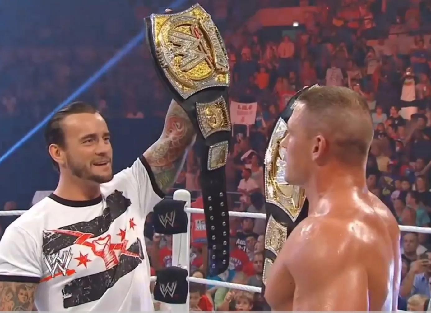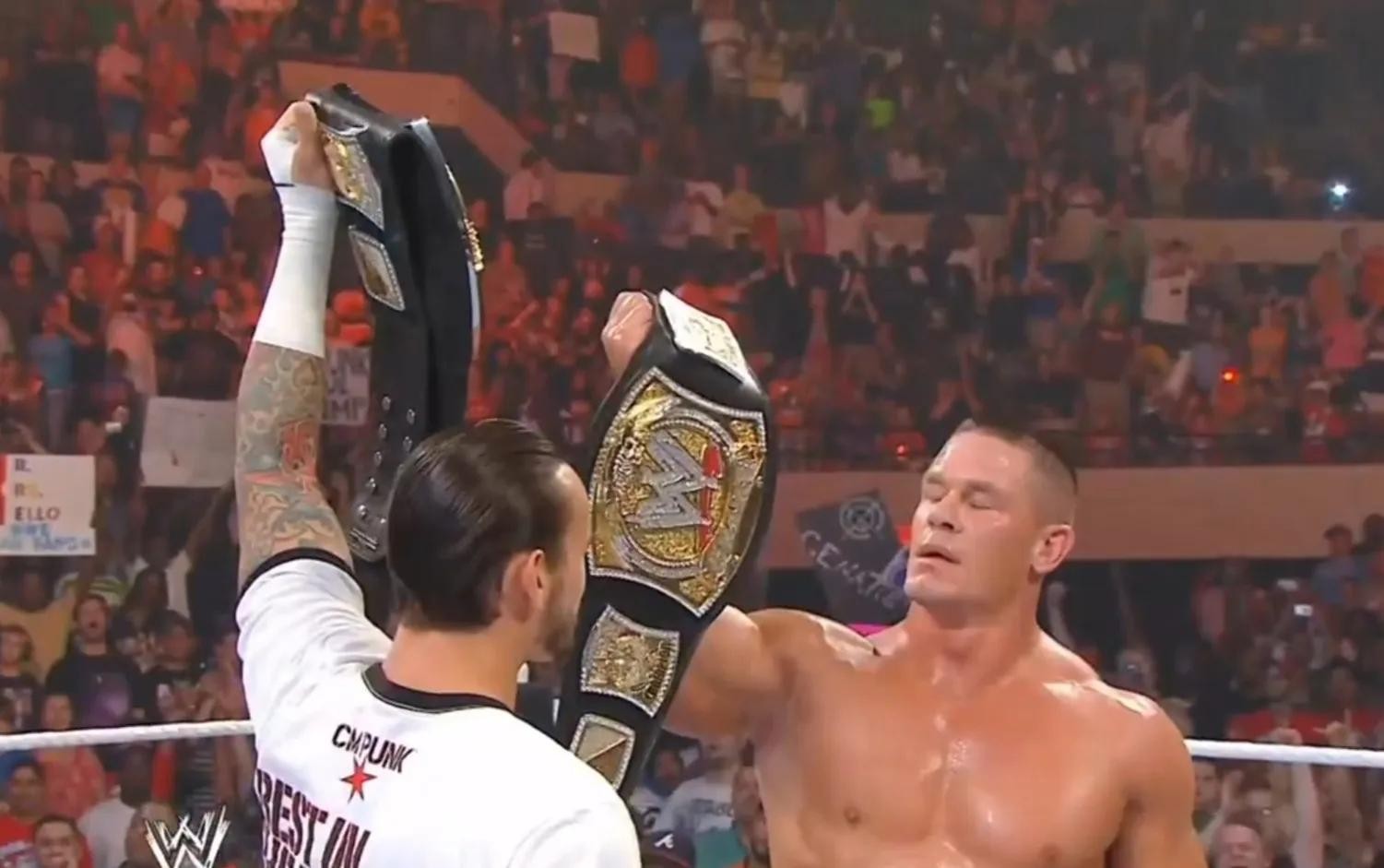 才赢得比赛,重新成为WWE冠军,同样是还没来得及庆祝,CM朋克便带着以前那条腰带和新的出场音乐出场了,这也是WWE历史上首次出现双WWE冠军腰带,双冠军腰带持有者站在一个擂台上的局面。