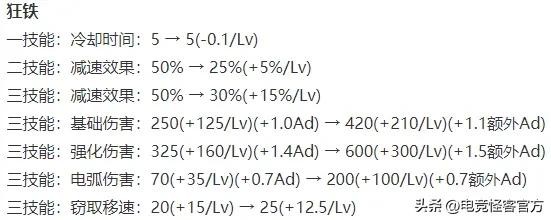 狂铁的改动比较多,但基本也是数值改动。一技能CD从固定5秒,改为了5~4.5秒。
