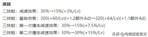 廉颇二技能减速效果前期对半砍,基础伤害基本上没太大变化。但三技能第一次和第二次撞击前期的减速效果都有比较明显的削弱,这也意味着廉颇前中期大招的留人能力会下降。