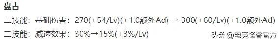 盘古二技能减速效果前期对半砍,后期不变;作为补偿,二技能的基础伤害和等级伤害加成略微增加。