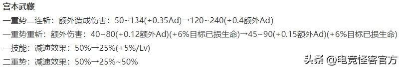 宫本一技能减速效果以及二重势的减速效果前期都是对半砍,后期不变。作为补偿,一重势二连斩额外造成的伤害有较大提升,一重势重斩额外伤害小幅提升。