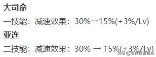 大司命和亚连的调整类似,大司命一技能、亚连二技能的减速效果都是前期对半砍,后期技能满级了不变。