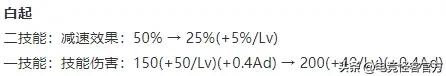 白起二技能减速效果前期对半砍,后期不变,作为补偿,一技能的前期伤害增加。
