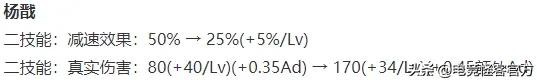 杨戬二技能减速效果前期对半砍,后期不变;二技能基础伤害数值有较大提升,同时AD伤害加成改为了额外AD加成。