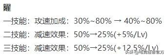 曜一技能攻速加成前期增加10%,但二技能和三技能的减速效果都是前期对半砍,后期不变。