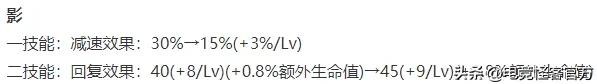 影一技能减速效果前期对半砍,后期不变;二技能回复效果略微提升。