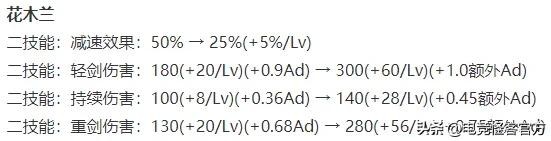 花木兰二技能减速效果前期对半砍,后期不变;二技能的轻重剑及持续伤害都有较大提升,但AD伤害加成改为了额外AD加成。