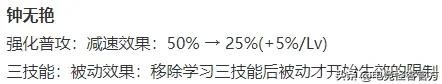 钟无艳强化普攻的减速效果前期对半砍,后期不变。作为补偿,钟无艳三技能的被动护盾,可以在4级学习大招之前生效了。