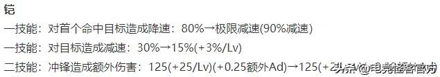 铠一技能对首个目标的减速效果提升了10%,但对后续目标的减速效果前期对半砍,后期不变。这其实算是一波加强,因为至少铠对单个目标的留人能力增加了。