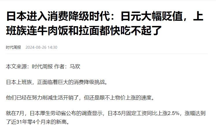 时代周报《日本进入消费降级时代:日元大幅贬值,上班族连牛肉饭和拉面都快吃不起了》2024-08-26
