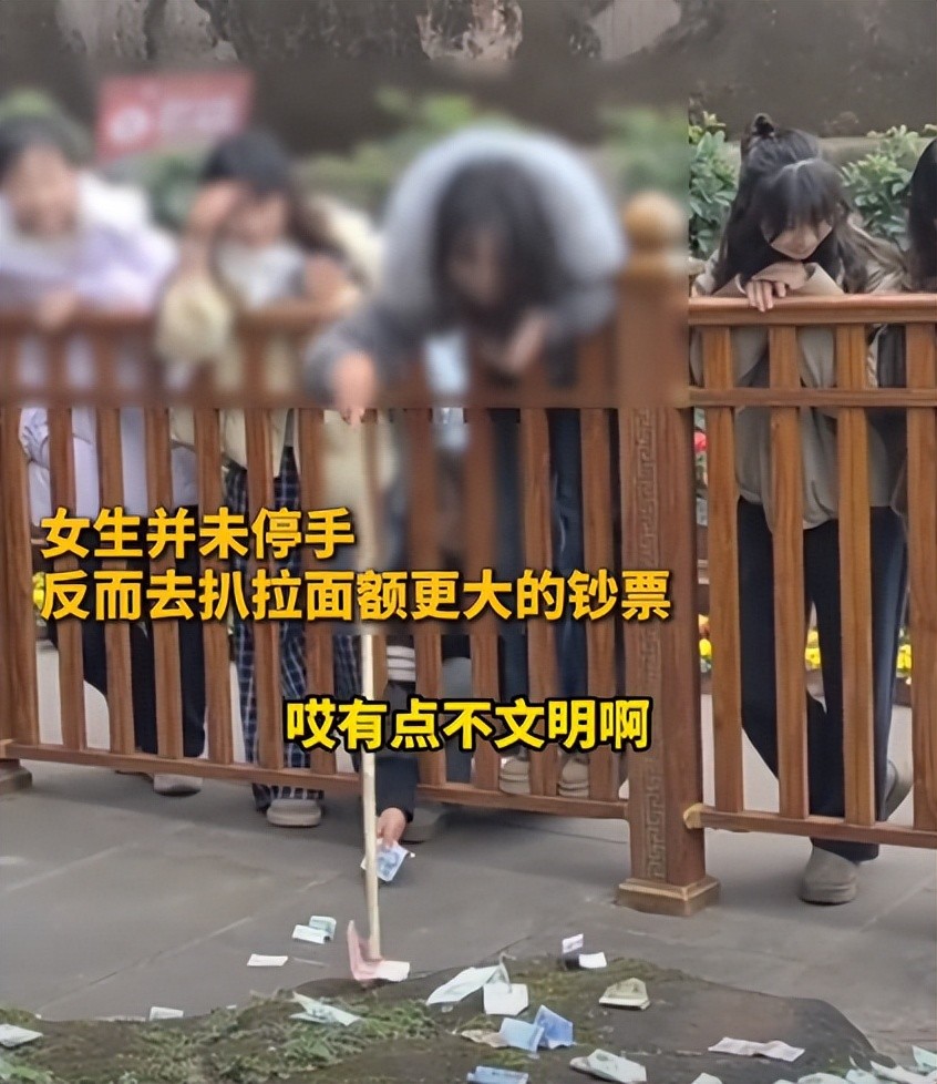 两个女孩还一起翻找,专门挑选面额大的往外划拉,甚至还有百元大钞,灰色衣服的女孩先拿着竹竿翻找,但是看到百元大钞后自己没有够到,于是将竹竿交给黑衣服的女孩,够到钱后就往自己的身边划,然后将钱揣兜里带走。