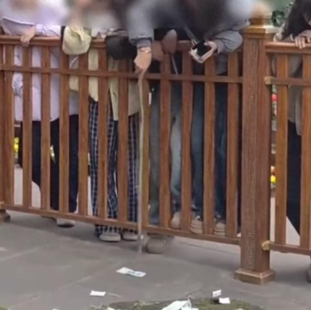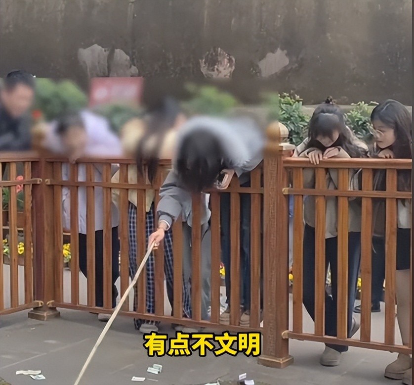 然而在乐山大佛的景区里面却发生了一件令人生气的事情,在乐山大佛围起来的许愿区内有许多游客在里面投钱,满地都是花花绿绿的,然而这时候却有两个女子,拿着一根不知道从哪里找到的竹竿,伸到游客扔出的许愿钱里面不停的翻找。