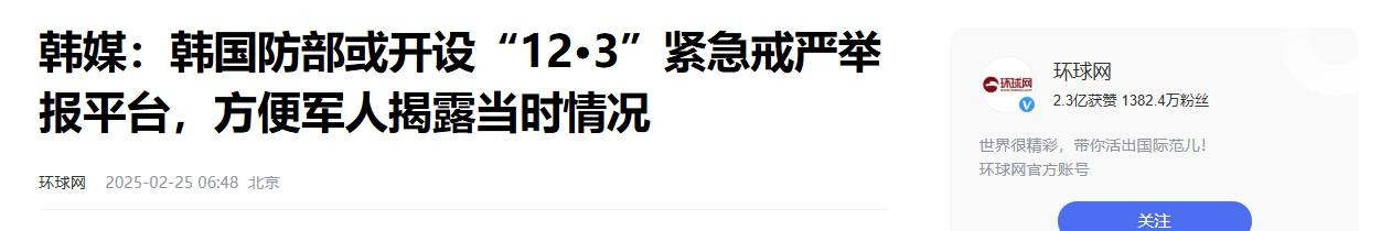 参考信源:环球网2025-02-25韩媒:韩国防部或开设“12·3”紧急戒严举报平台,方便军人揭露当时情况