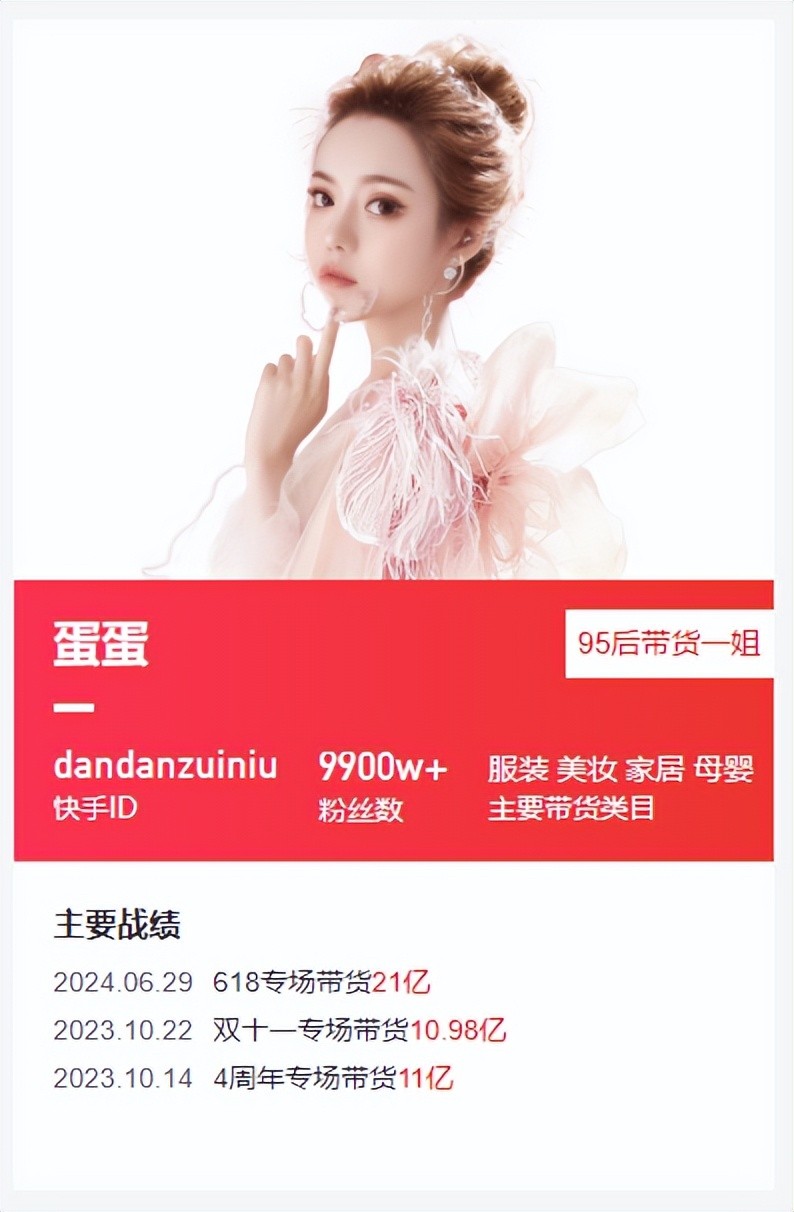 她首次亮相便吸引了超过30万的粉丝关注,在2020年双11直播活动中,蛋蛋更是凭借单场直播超2.7亿的销售额一战成名。这一年,蛋蛋在快手累计带货80亿,全网排名第四,仅次于薇娅、李佳琦、辛巴。