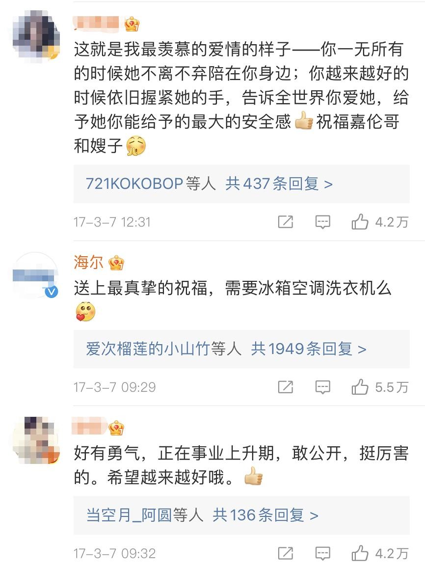 还有人在微博下评论任嘉伦清醒点,你现在是175万粉丝,不是1750万。也有粉丝对他的勇气敬佩,更为他们的这段感情,送上了深深的祝福。
