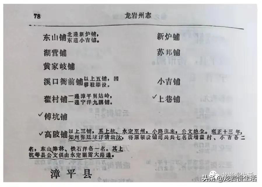 清乾隆三年《龙岩州志·规建志·邮传》载:“……上巷铺、傅坑铺、高陂铺,以上三铺,系上杭、永定至州,小路往来,公文绝少。雍正十三年,知州张廷球详请裁汰,将原额设铺司兵共七名拨增藿村、小吉各二名,东山、皞林、铁石洋各一名。其上杭等县公文俱由永定湖雷大路递。”(福建省地图出版社1987年7月第一版《龙岩州志》第78页)