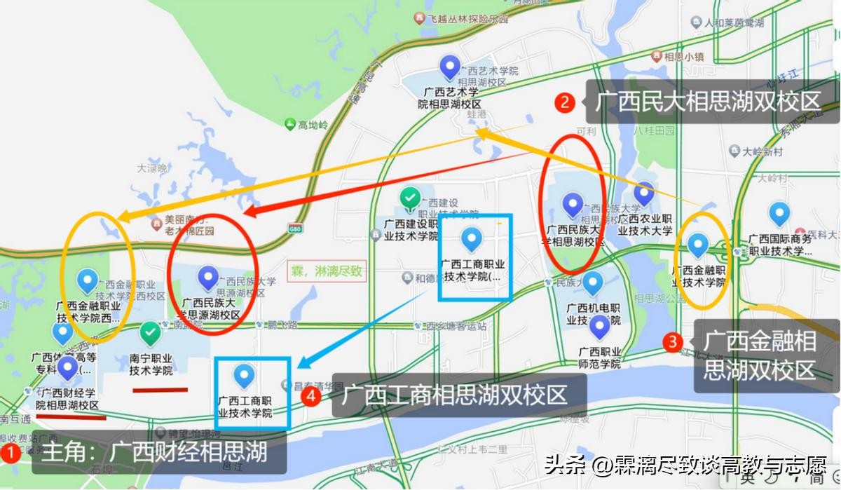 各位领导,我应该如何高情商的夸这样的布局呢?广西民大,广西金融,广西工商在相思湖大学城分别有两个校区,我要没记错,广西民大,广西财经,广西工商,广西国际商务在武鸣大学城都有新校区。