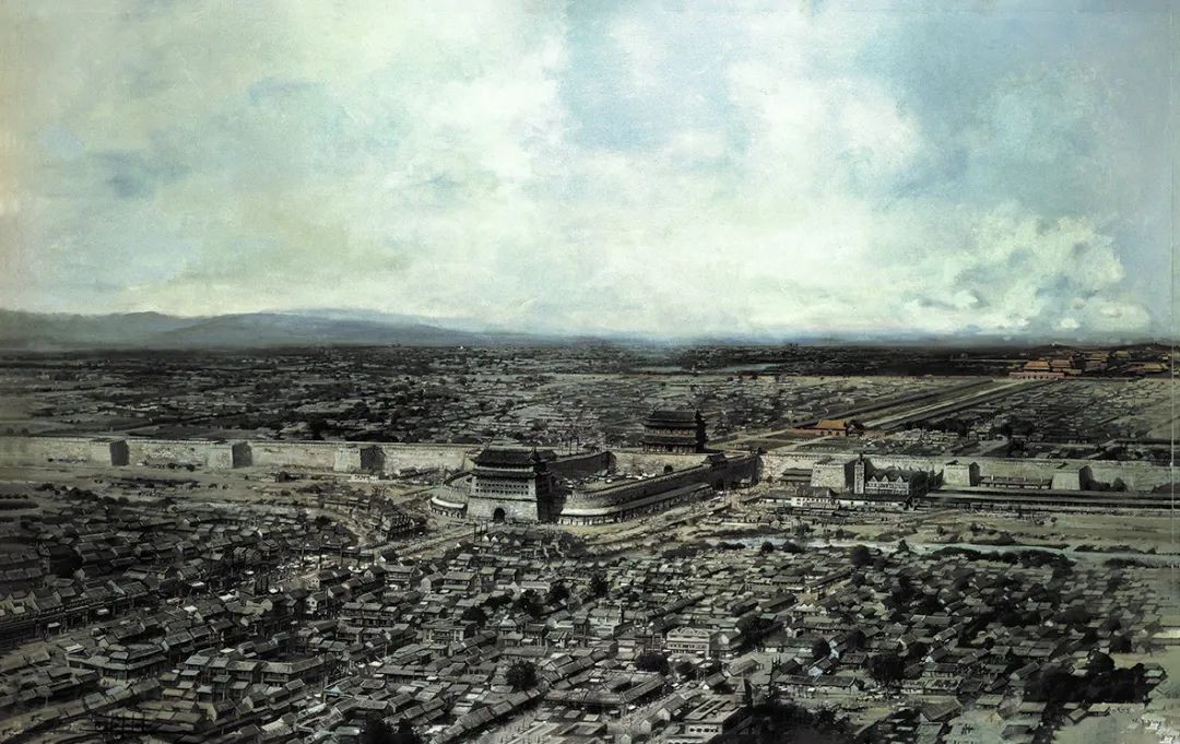 艺术家结合老照片和史料,复原了北京前门地区1907年至1915年的历史风貌,画面正中是老北京俗语中的“前门楼子九丈九,四门三桥五牌楼”。作品详细描绘了前门、正阳门、瓮城、城墙、马面、正阳门火车站,以及天安门广场前身的千步廊和官署,直至金水桥和天安门,气势恢宏,得以一窥老北京中轴线的壮观。